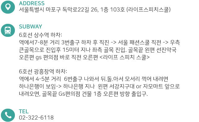상호 : ㈜라이프스피치스쿨 | 대표자: 강민정 | 주소: 서울시 마포구 독막로 22길 26, 1층